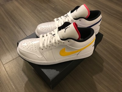 Lakers jordan 1 low. Air jordan 1 low se. Synthetic leather and patent leather upper. This aj 1 mid sports a white upper with yellow accents black nike swoosh white midsole and a yellow sole.